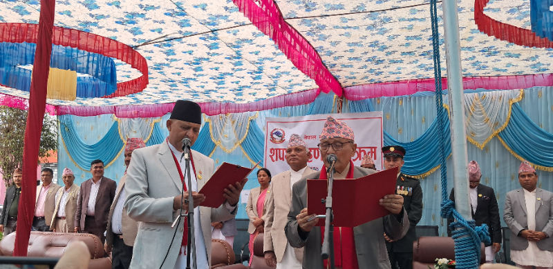 प्रदेश प्रमुख शेरचनले एमालेका भुमिश्वर ढकाल, दिनेश पन्थी, सीता शर्मा, खेमबहादुर सारु र कांग्रेसका सरोज थापा, धनेन्द्र कार्की, बादशाह कुर्मी र प्रचण्डविक्रम न्यौपानेलाई बिनाविभागीय मन्त्रीको शपथ गराएका हुन् । नवनियुक्त मन्त्रीहरूको दुवै दलबीच सहमतिपछि मात्र विभागीय जिम्मेवारी तोकिने छ ।