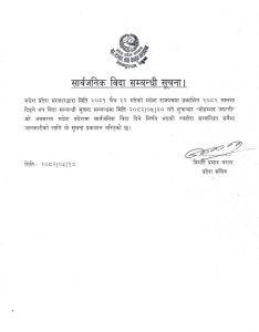प्रदेश सरकारका गृह, सञ्चार तथा कानुन मन्त्रालयका सचिव विमलप्रसाद बरालद्वारा आज जारी सूचनामा शुक्रबार प्रदेशभरि सार्वजनिक बिदा दिने निर्णय गरिएको जनाइएको छ ।
